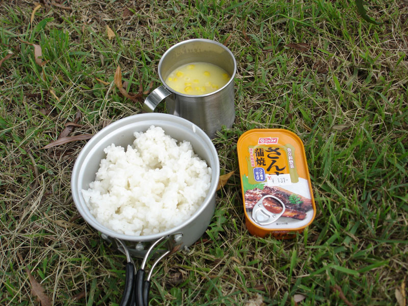 再び公園に戻りテントを張る。 ご飯を炊くが水が少なくてけっこう硬くなってしまった…… 失敗。。。