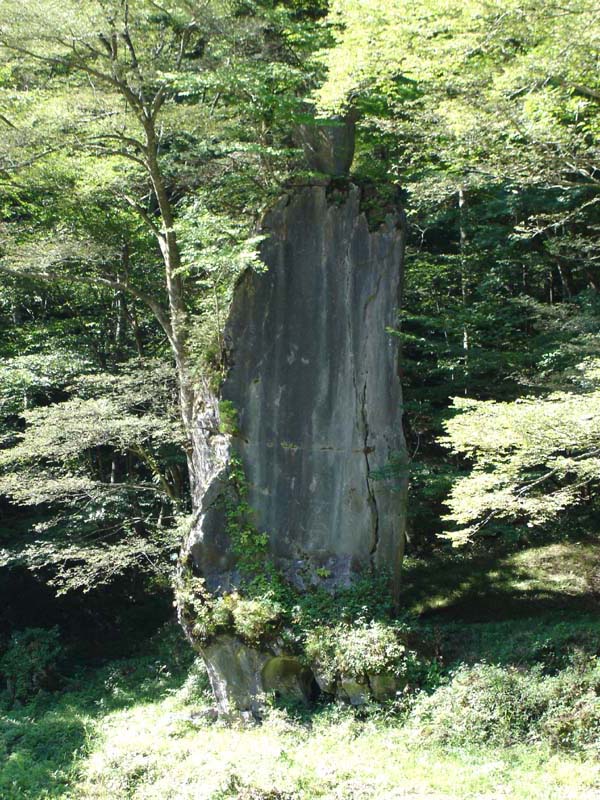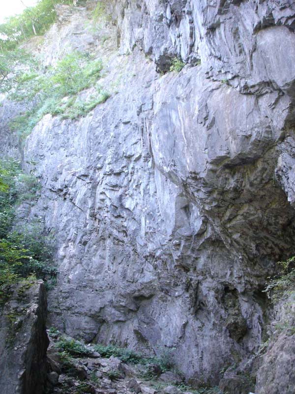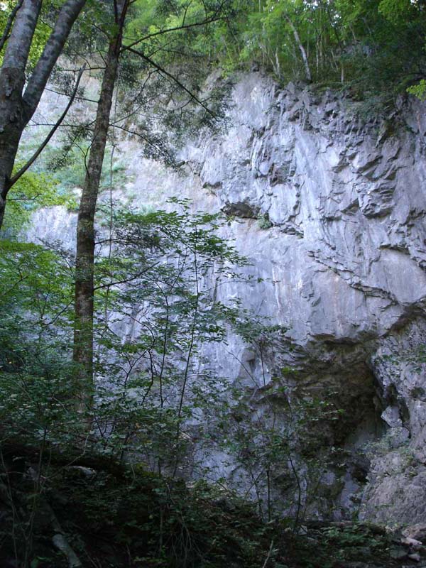 すると沢を横断して、また山を登っていった。 それからぐるっと回るように登り、上の方に大きな岩壁が見えてきた。 岩壁の5メートルくらいのところまでくると、とても冷たい風が吹いている。 おお、ここが鍾乳洞か!