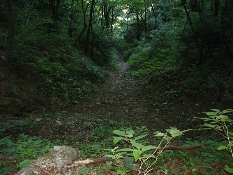 見ようと思えば見える程度の踏み跡らしきものがあるので、それに沿って山の斜面をあがっていく。 かなり傾斜がきつい。 そこを5分くらい登って「やっぱり引き返そう」と思った。 どう考えてもこの踏み跡はおかしい。 人が来るくらいならもっときちんとした跡が残ってるはずだし。