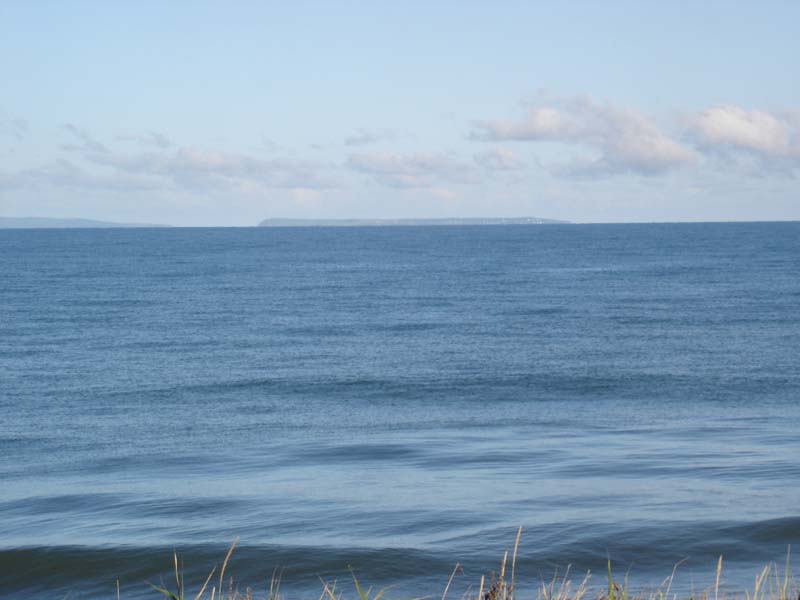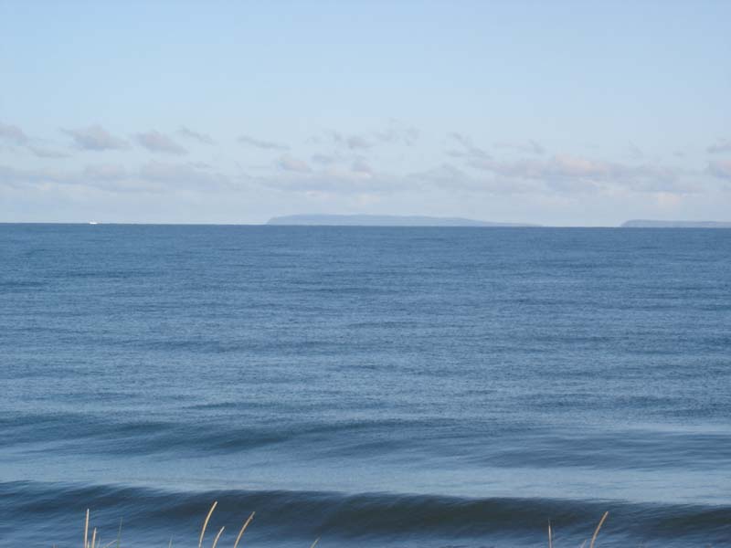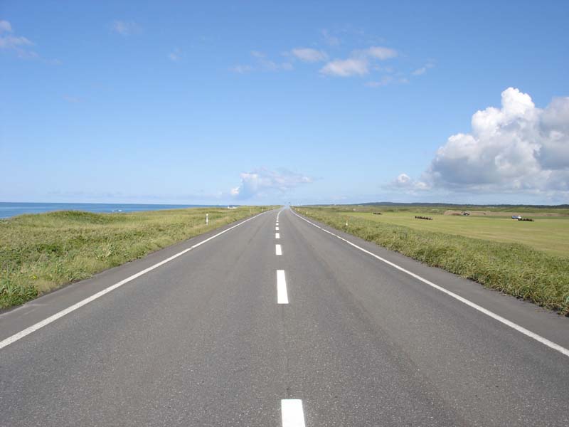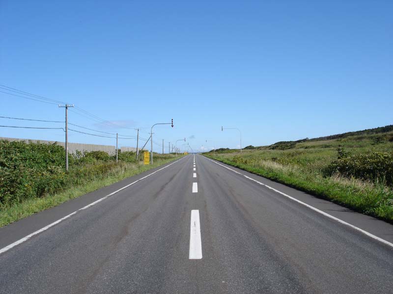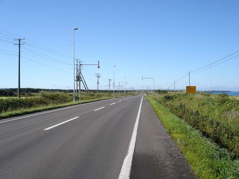 ここからは国道をはずれて道道(北海道の道)で行くことにした。 海沿いの道を走る。 ここはひたすらまっすぐでどこまで行っても先が見えない。 道路の先っぽが見えない…… こういうのも地平線っていうのかな? はじめてみる地平線っぽいもの。 うーん。