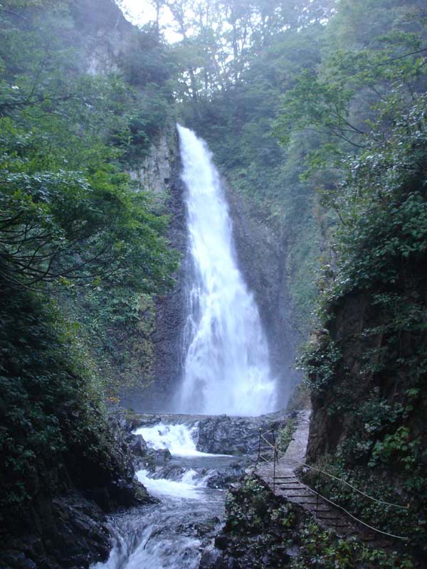 まず1つ目の滝。 かなりの迫力! 2つ目……これは滝じゃなくて濁流!? 3つ目、遊歩道にまで水が溢れている。 4つ目、滝つぼに落ちたら死にそう……