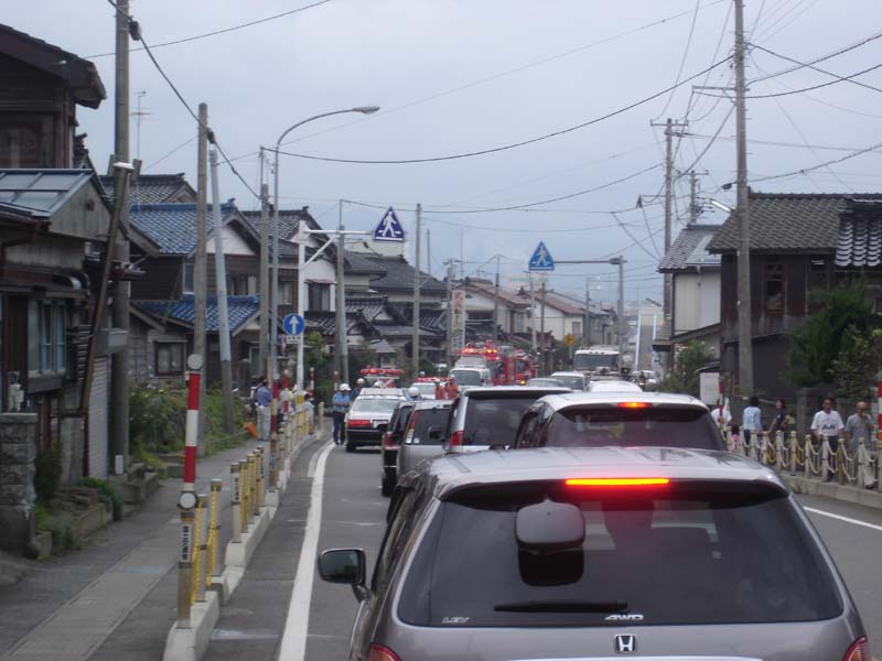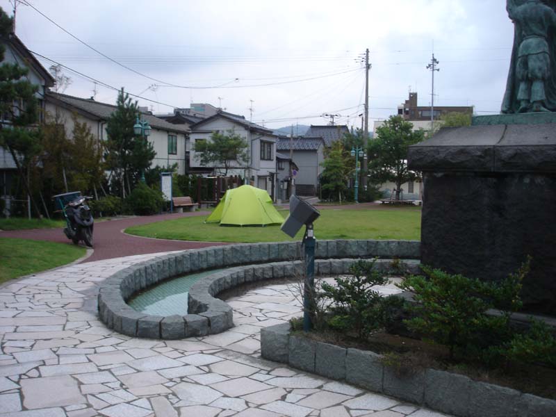 近くの公園を探してさっそくパソコンをつける。 HP更新した。 よし出発! と思い荷物をまとめていたら、役所勤めっぽいおじさんが声かけてきた。 「千葉県八千代市から来たの?」と。 本当は佐倉市から来たのだが、ナンバーが八千代市なので。 それを説明するのが面倒なので、いつからか忘れたけど「八千代市から来てる」ということにしてある。 実際八千代市には3箇所、16年住んでいたので何を聞かれてもわかるよ。 そのおじさんは昔八千代市に住んでいたらしい。 旅のルートや予算を聞かれたので答えた。 いろいろ話してそのおじさんが「そうだ、いいものあげるよ」と車に物を取りにいった。 そして持ってきたのがリンゴ! 石川県産のリンゴらしい。 3つもいただいてしまった。 ありがとう。