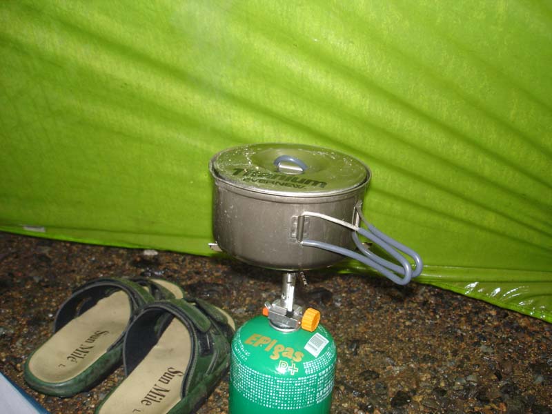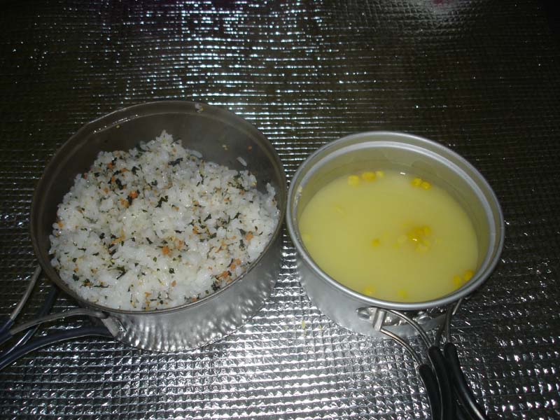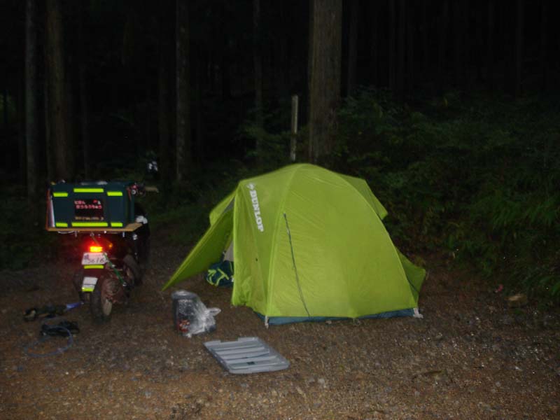 今のところ雨は降っていない。 台風通過したかなぁ…… ラジオを聞くが肝心の天気予報がやっていない。 5時くらいにテント内が片付いた。 このキャンプ場の近くに滝がある。 それを見てから出発しようと思う。 しかしまだ太陽が出ていないため真っ暗。 真っ暗じゃ写真も撮れないしなぁ…… 明るくなってから出発しよう。 テントの外側も内側もビショビショ…… まずこれをなんとかしなくては…