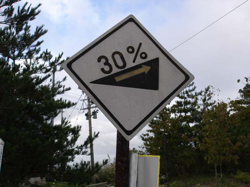 頑張って走り、ようやく山頂直下までやってきた。 しかしそこで信じられないものを見てしまった。 「勾配30%」の看板…… 30%って…… こんな坂上れるのかなぁ…