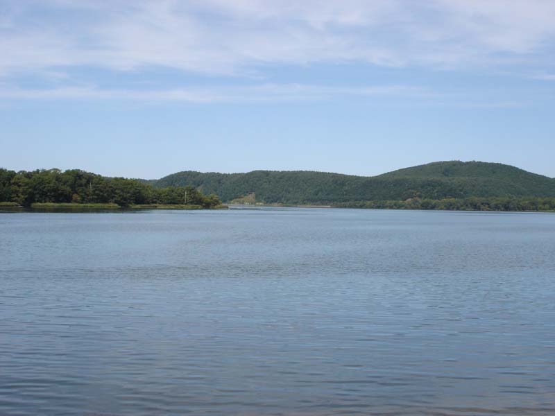 しかし走っているところがかなり田舎のため、施設などが何も無い。 昨日と同じように林道の入口に張るようになるのか…… しばらく走っていると大きな川を発見。 橋の途中で止まって、下を眺めてみる。 川原がかなり広くていい感じ。 丸くて大きな石がいっぱい転がっているが…… 川原にバイクで下りられるかな。 とりあえず橋を対岸まで渡ってみる。 しかし川原への降り口はない。 Uターンして橋の手前までやってくる。 林道の入口があってそこを進んでみたら川原のすぐ近くまで行くことができた。 だけど手前にも分流した幅3mくらいの川があるため、川原にバイクを持っていくことは無理だった。 仕方ないので橋の下まで無理やりバイクを運ぶ。