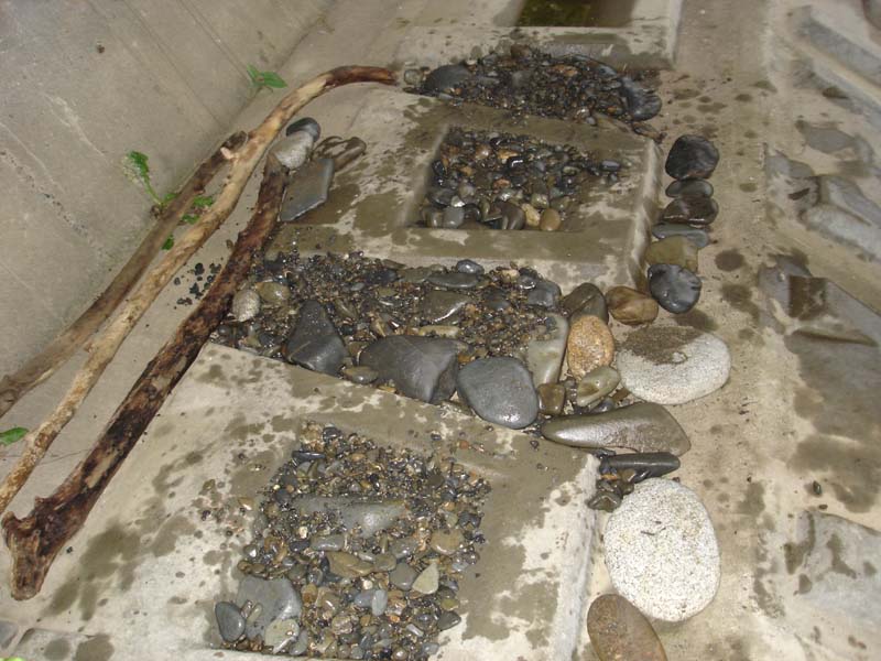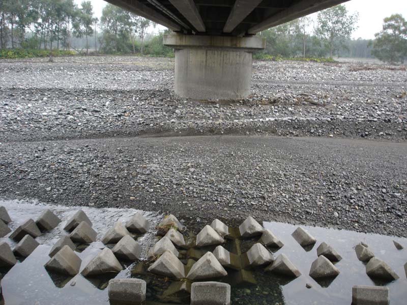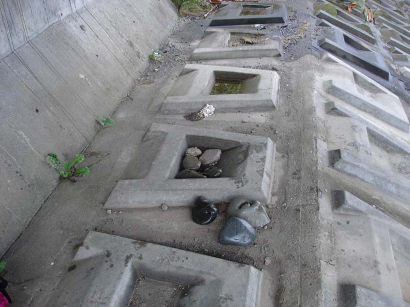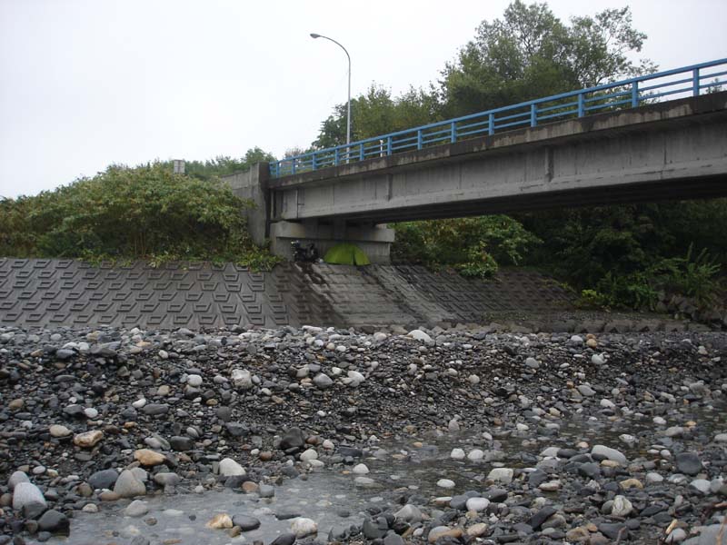 そしてテントを張る場所を検討する。 川原だと石が小さい場所もあって、なかなか寝心地が良さそう。 だけど増水したら終わりだし、バイクとの距離が20mくらいあいてしまう。 なので、橋の基部のコンクリートの上にテントを張ることにした。 しかし、コンクリートの模様のため、とてもデコボコしている。 まずこれを平らにしなくては。 川原から石を運んできて、デコボコを直す。 だいたい平らになったら、小石をたくさん拾ってきてもっと平らにする。 作業すること1時間……ようやく寝ても大丈夫なくらい平らになった…… 疲れた~