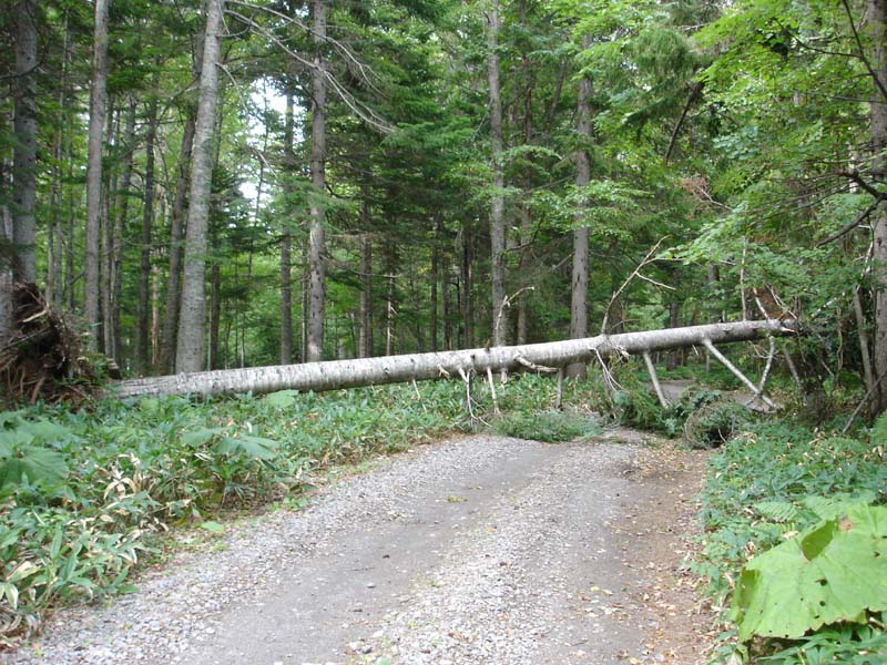 ここでも寄り道をして「チミケップ湖」という湖に向かう。 町道を走ること10km、あと林道を3km走ったら湖だ! と、思ったのだが、目の前にはバリケードが…… 通行止めだ…… バリケードの前に車が止まっていたので話してみる。