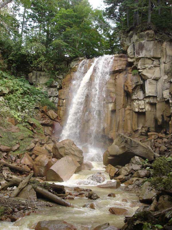 そして「白藤の滝」を見る。 なんだか人工のような滝だ。 もちろん何も手は加えてないと思うが。 スパッと切れた岩から落ちる滝はとてもよかった。 だけど台風の影響(?)で水が濁っていたのが残念…… 再び阿寒湖に向かう。