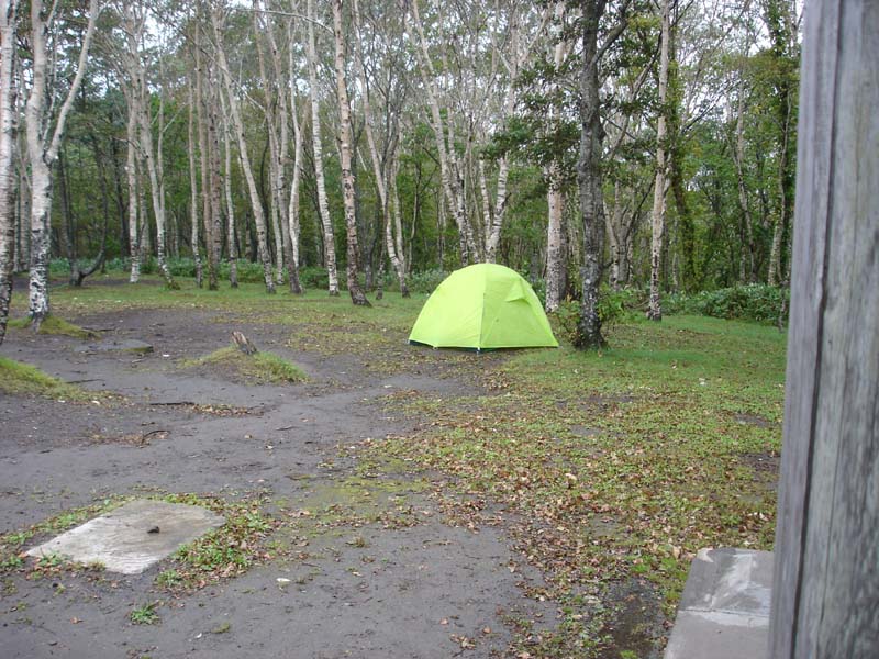 ようやくキャンプ場に到着。 「室蘭岳山岳総合公園自由広場」というところ。 誰もいない。 キャンプ場独占!! 水場の近くにテントを張った。 濡れたザックやレインコートを雑巾で拭いてテントの中に逃げ込む。 明日の昼くらいまで雨が降るらしいので、フライシートをピンピンに張った。 テントの中で携帯をいじったりラジオを聞いたり…… すっごい暇…… お昼にラーメンを食べたら眠くなってきた。 12時~14時くらいまで寝ていた。 外はすごい雨…… 雨水がテントの中に入ってくる。 内側からトイレットペーパーで拭く。 きついなぁ。