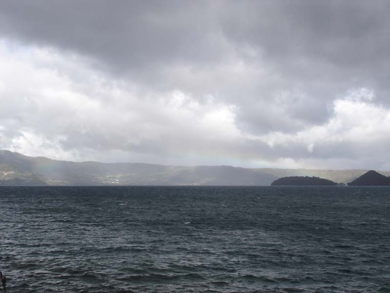 湖からそれて国道を走っていたら霧雨が降ってきた。 だんだん雨が強くなってきた…… また雨かよ~ レインコートを着て走る。 弱くなったり強くなったり……遠くのほうの山は太陽が当たっている。 こういう天気腹が立つなぁ。 晴れるなら全部晴れる、雨なら全部雨とはっきりしてほしい。