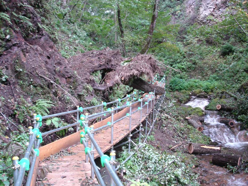 遊歩道を歩いていると、目の前に倒木が…… 倒木によって遊歩道の手すりが壊れてしまっている。 これも飛び越えないといけないなぁ。 もし足が滑ったら川に落ちてしまうが、そんなミスはしない。 倒木を越えるとすぐに滝が見えてきた。 しかしショボイ…… すぐに駐車場に戻る。 つまらない滝だったなぁ。 この前の富良野で見た滝がすごすぎたのだろうか…… この滝も本州で見れば「すごい」と思えるのかな。