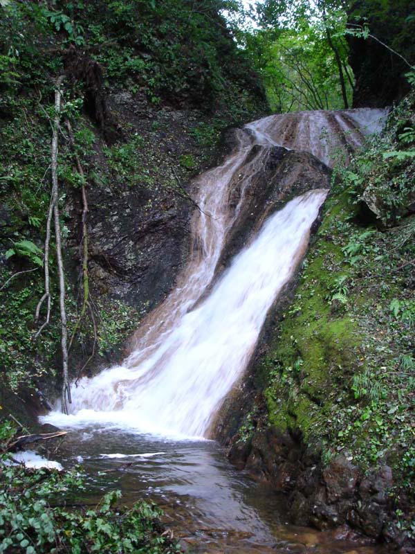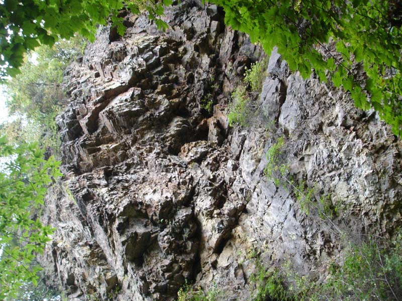 洞爺湖周回道路に入った。 クライミングエリアに向かって走っていると「キムンドの滝」という看板を発見! ここから2kmくらいなので行ってみることに。 駐車場についてみると看板がある。 「川増水のため滝方面には行けません」と書いてある。 また台風の影響? とりあえずいけるところまで遊歩道を歩いてみることに。 すぐにゲートがあったのだが、高さ1mくらいしかないので飛び越えて先に進む。 川は全然増水してるようすがないよ…… 遊歩道の両脇に岩があった。 「ここの岩登れるのかなぁ」と思って見ていると、ボルトが打ってあるではないか。 しかもきちんと終了点まで作ってある。 ということは、誰か登っていたんだな…… ルートは1本しか見当たらなかった。 しかも簡単そう。