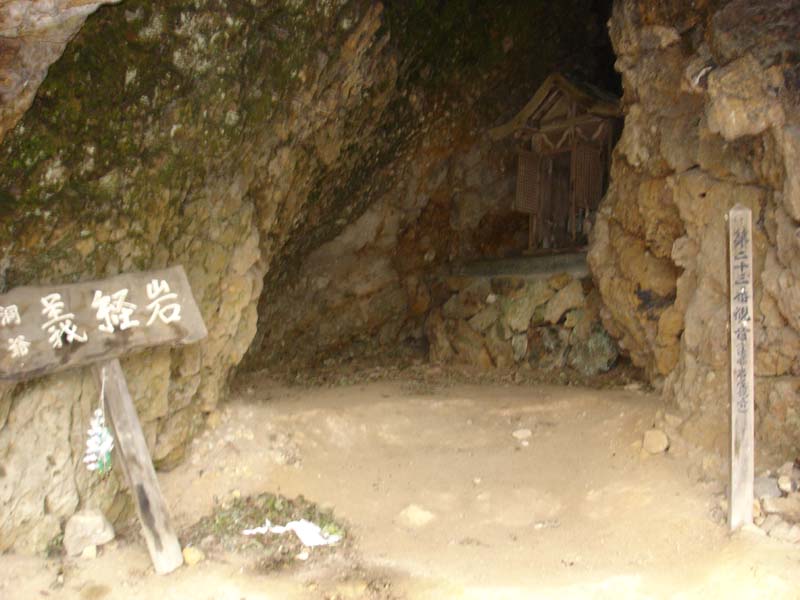 いったんバイクを降りてアクセルを回してエンジンをうならせている状態で押して歩いた。 それでもかなりきつかった。 この道ヤバスギ…… 少し傾斜が緩くなってきたので、またバイクに乗って走る。 少し走るとクライミングエリアに到着。 「義経岩」という場所だ。
