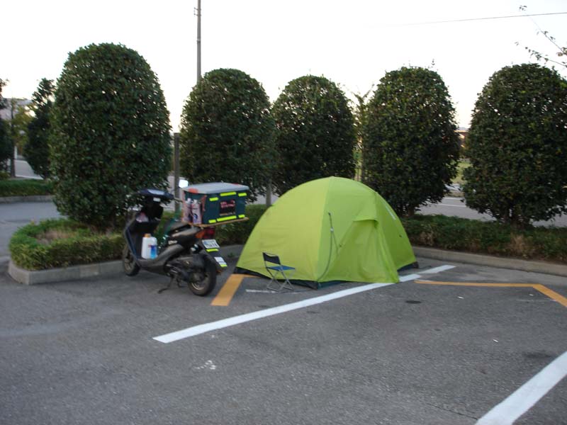 公園は思っていたより小さかった。 だけど駐車場がものすごくでかい。 公園内の芝生にテントを張りたかったのだが、バイク乗り入れできないから荷物運びが大変。 駐車場のコンクリートの上でいいや。 まだ太陽が出ているのでビショビショのテントを乾かす。 その間にバイク修理をした。 とりあえず3点で固定した。 あと1点は部品がなくてできなかった…… これで走ってみてダメだったらまた修理しよう。 車の出入りがけっこうあるので今日はゆっくり寝られなそう……