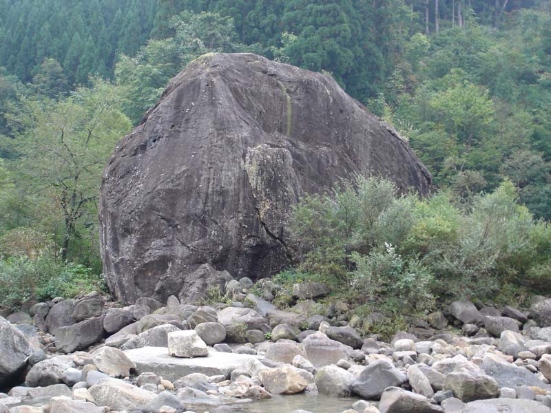 そしてようやく「百万貫岩」というところに到着した。 川の中州にかなり巨大な岩が転がっている。 たかさ10mくらいあるだろうか。 この岩は昭和の大洪水で上流から流れてきたものらしい。 重さはなんと4,839トンもあるらしい。 こんな重い物を流してしまうなんて……恐るべき自然の力……