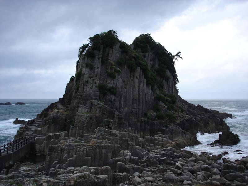 さて、これからどうしよう。 とりあえず福井県で見るものは見たって感じかなぁ。 海沿いで南下しようかな。 次の目的地は滋賀県だし。 海沿いの道を走る。 すると「鉾島」というのが見えてきた。 なんだか斜めっている岩だ。 とりあえず見てみるか。 駐車場にバイクを止めて見に行こうと思ったとき、ものすごい腹痛に襲われた…… ヤバイ。。。 トイレに避難。 なんだろう、この腹痛。 食あたりになったみたいな痛み…… なんか変なもの食べたかなぁ。 時間的に、スーパーで買ったパンだろうか。 スイートブールとレーズンパン、メロンクリームのパン。 このどれか? 朝コンビニで買ったやつは、時間的にかなり過ぎてるから違うと思うし。 それかペットボトルの水か…… なんだかスイートブールが怪しい。。。 トイレで格闘すること20分ほど……ようやく腹痛が落ち着いた。 とりあえず「鉾島」に登ってみるか。 ちゃんと遊歩道で上ることが出来るようになっている。 上から岸を眺めていたらまた腹痛に…… 急いで岩を下りてトイレに避難…… さらに20分くらい苦しむ。。。 腹の中の悪いものを全部出してしまうまで痛み続けるのかなぁ…… 食あたりなんて、ほとんどなったことないからわからない。