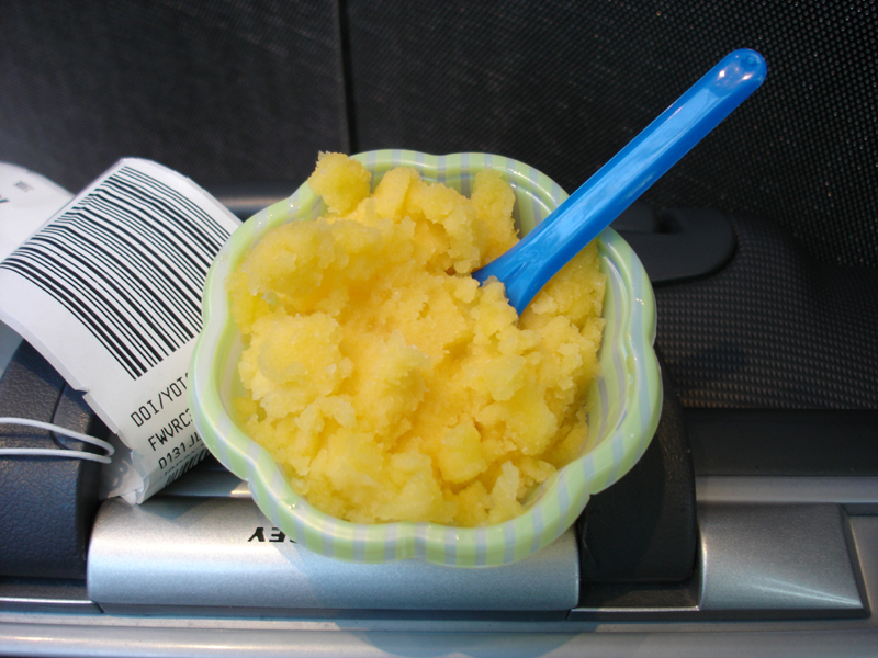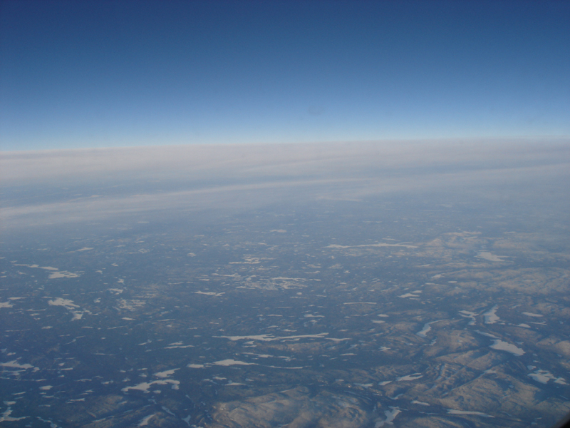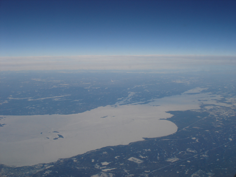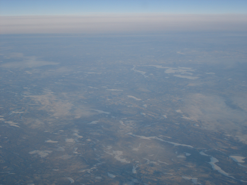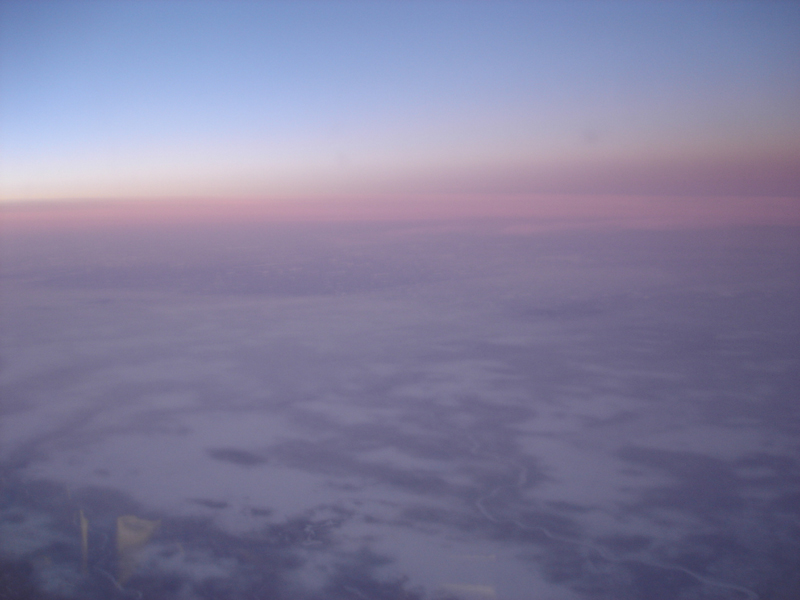 いつもなにか外は夜になっていた。 そしてシカゴ上空あたりから陽が昇り始めてだんだん明るくなっていく。 下を見ると池や川がたくさん。 凍っているのかわからないけれど、白っぽく見えた。