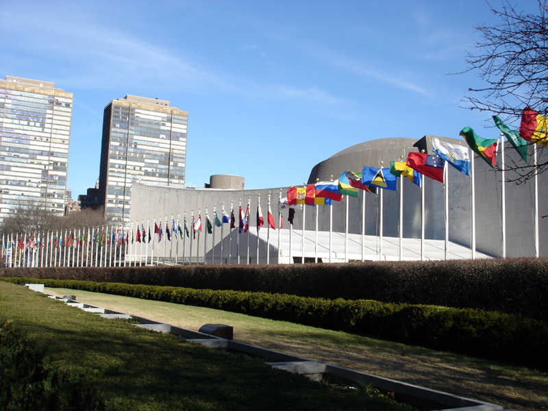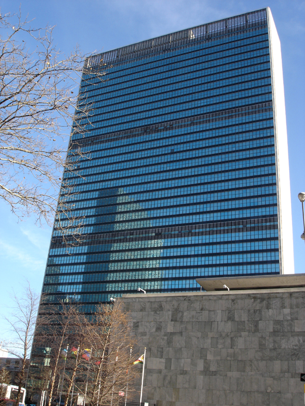 さて、ニューヨークの街に遊びに行こう。 どこに行こうかな…… 近くに「国連本部」があるので行ってみる。 数え切れないほどの国旗が掲げられている。 ここで世界の平和についていろいろ会議をしたり実行したりしているらしい。 建物はとても立派だったけれど、中に入ることはできなかった。
