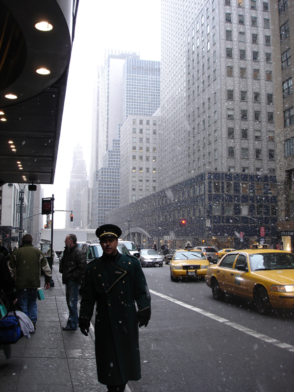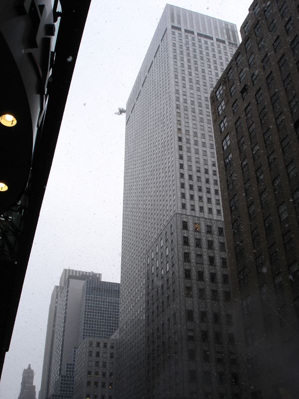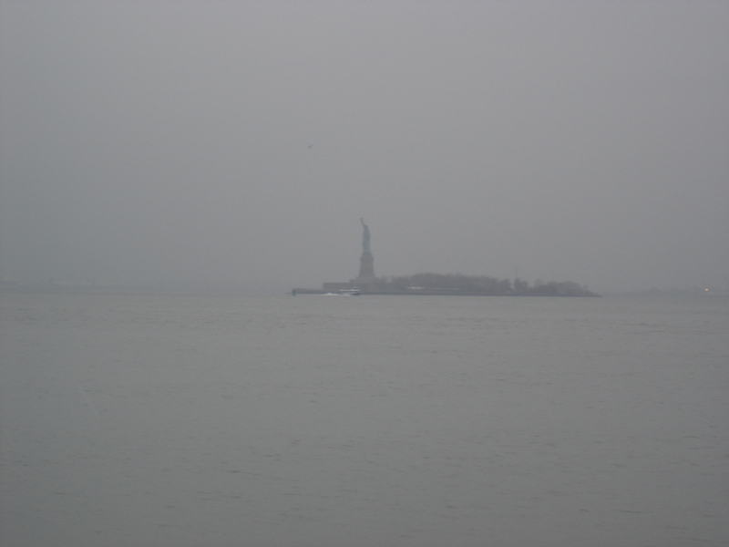 そして自由の女神に向かう。 自由の女神は島にあるので、そこに行くにはフェリーに乗らなくてはならない。 フェリー乗り場でチケットを買おうと思ったら、もう最後のフェリーの分まで売切れてしまっていて買うことができなかった。 残念だけど、雪でかすむ中遠くから自由の女神を写真に撮った。