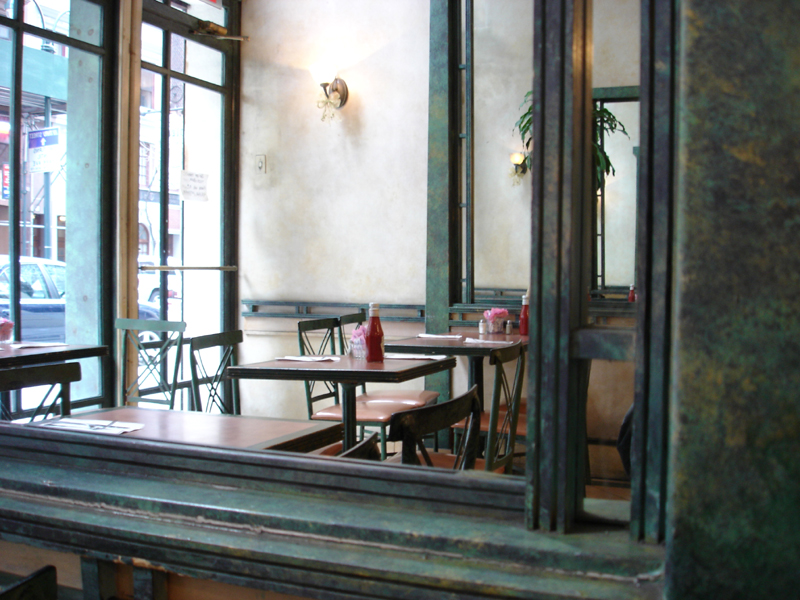 エンパイアステートビルは歩いて15分ほどの距離なので歩いて向かう。 途中に喫茶店みたいなところがあったので食事をしていく。 喫茶店だと思って入ったところはハンバーガーショップみたいなのだった。 読めないものばかりなので「スイスバーガー」と「カフェラテ」を頼んだ。 「French %*!#\?」と聞かれたがわからなかったので「Yes」と答えた。