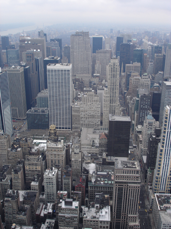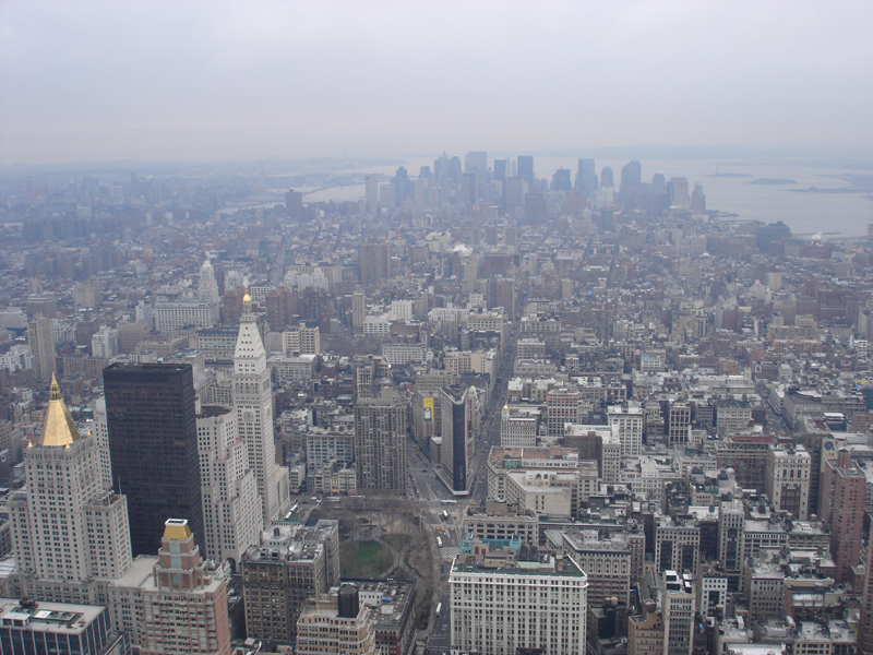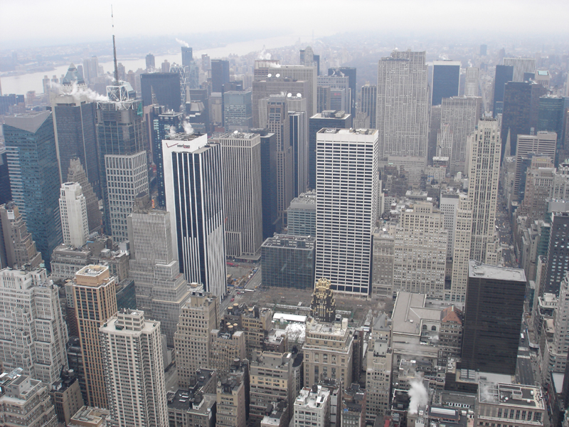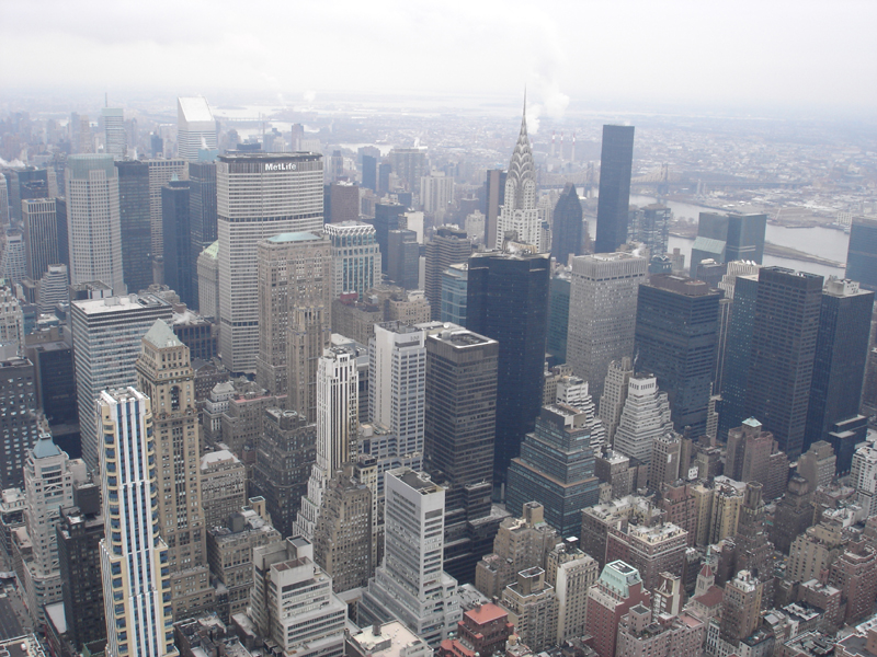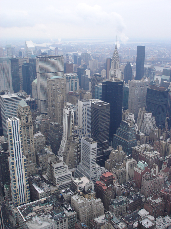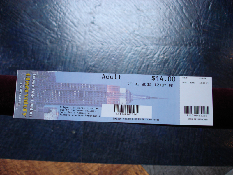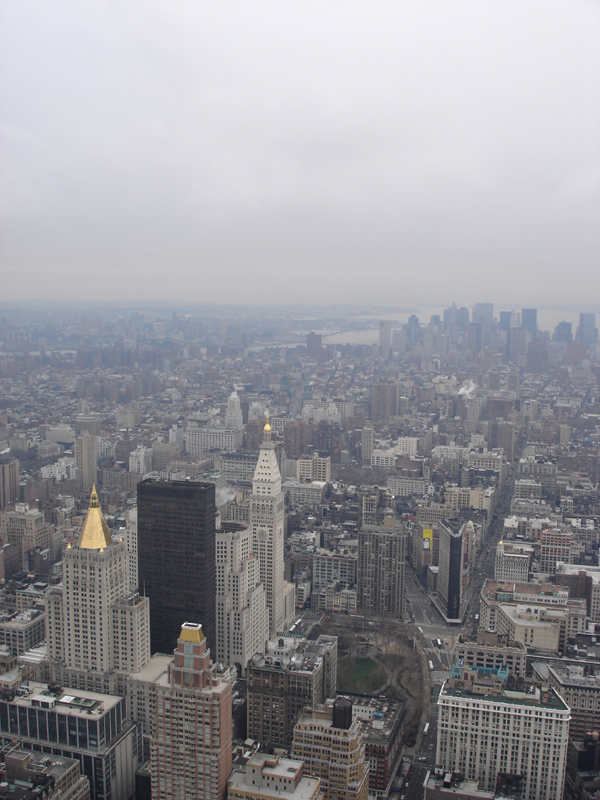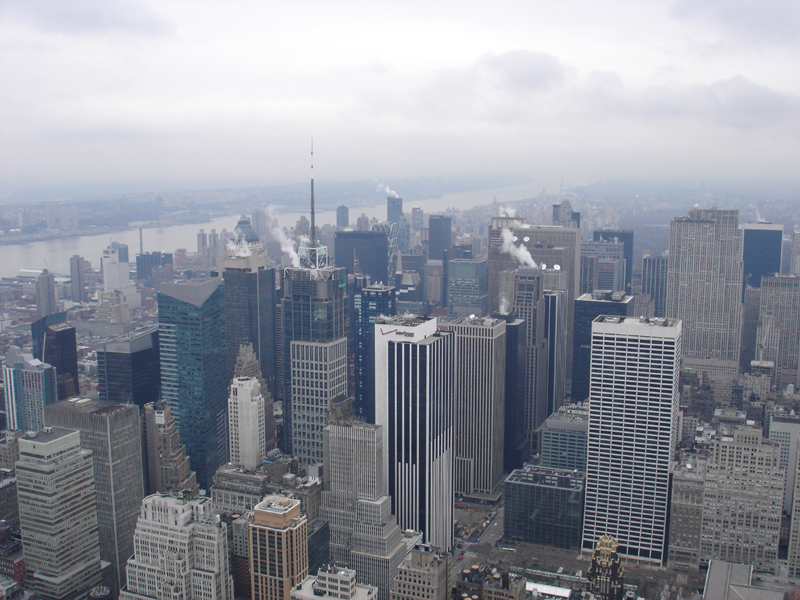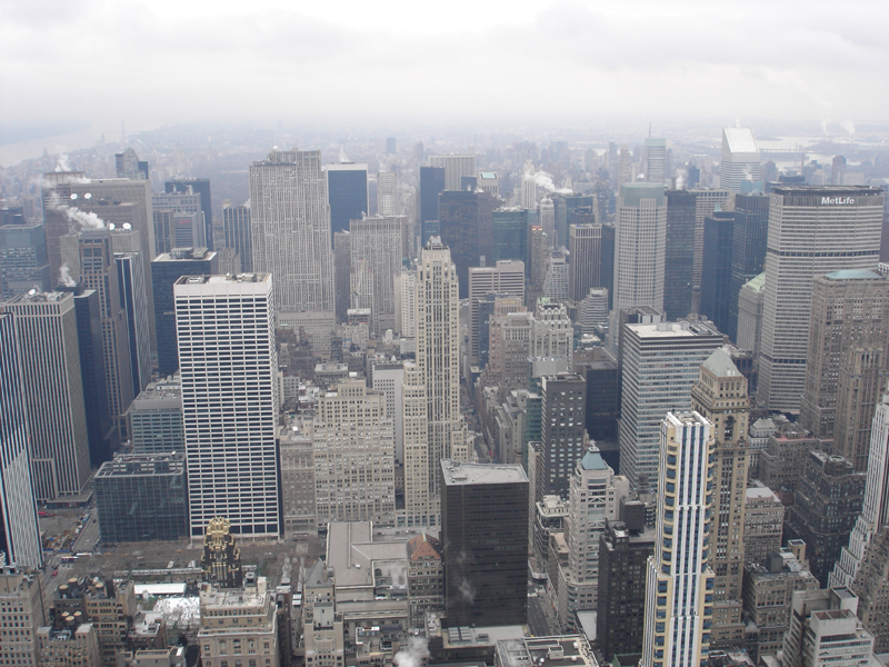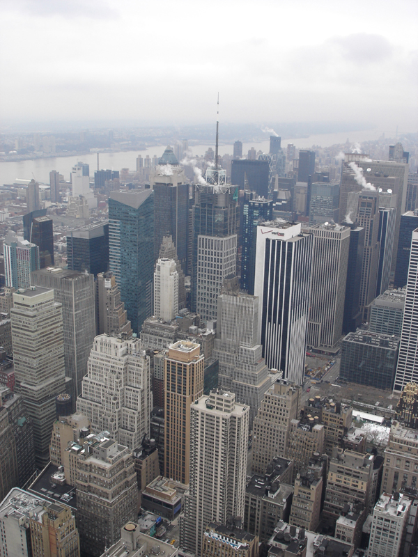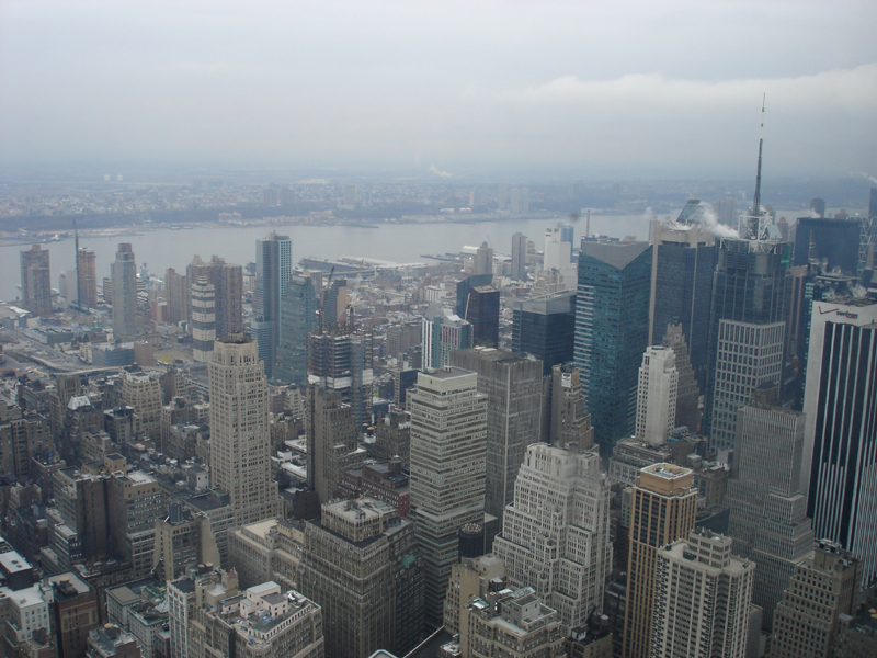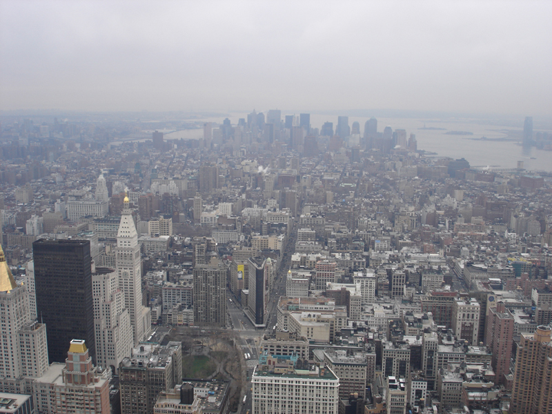 お腹を満腹にして代金とチップを払ってエンパイアステートビルに向かう。 ガイドブックに「いつも行列ができている」と書いてあったので覚悟はしておいた。 ビルの外まで行列は続いており、最後尾に並ぶ。 2Fのチケット売り場で展望台のみのチケットを買って、セキュリティチェックを受けてエレベータに乗り80Fまで一気に上がる。 ここで写真を撮られてまたエレベーターに乗って86Fへ。 ここが展望台! ここまでくるのになんと2時間…… 混みすぎ……