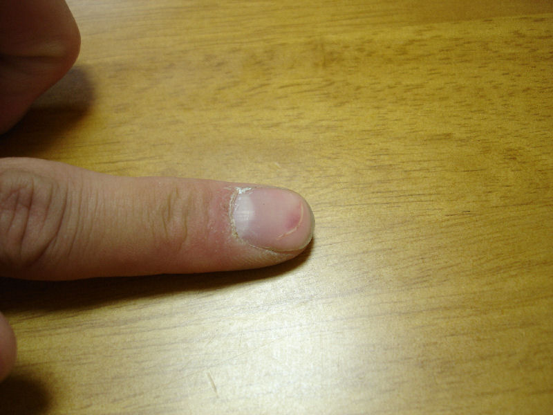 かなり力を入れて切ってるときで、右手で力を入れてカッターをひいている手が滑って、物を押さえてる左手に突き刺してしまった…… 刺さった瞬間ものすごい痛みがした…… カッターを放り投げて右手で切ったであろう左手の人差し指の先っぽを押さえる。 ものすごいズキズキする。 1分くらいして右手をとってみる。 だけど、ものすごい痛みの割りにあまり血がでていない。 どこを切ったのか見てみたら、なんと爪だった。 カッターの刃は爪を突き抜けてその下の皮膚までいっていた。 こんなところ切ったのか…… 普段爪に守られている場所、そして爪と一緒に切ったからあんなにすごい痛みがしたのか。 一応絆創膏をはって止血を1時間くらいしていた。 やった瞬間はすごい痛かったけど、あとになるとそれほどの痛みはないかな。 爪がある場所でよかった…… もしあの力で爪のない場所切っていたら……爪を突き抜けるほどだから骨近くまでいっていたのかも。。。 危機一髪。。。