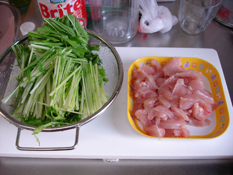 水菜を適当な大きさに切って、鶏肉をそぎ切りにするらしい。 そぎ切りというのが何かわからなかったので調べた。 どうやらものすごい薄さにスライスすることらしい。 うーん、難しい。