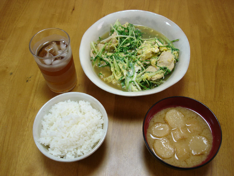 いろいろ見ていて「水菜と鶏肉の卵とじ」を作る事に。 近所のスーパーに水菜と鶏肉を買いに行く。 さてと、つくろうかな~