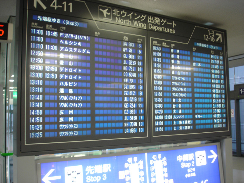 高松自動車道、徳島自動車道、あと大阪の高速道路を通り、3時間ほどで関西国際空港に到着。 初めての関空だ。 ここは海の上に埋立地を作って、そこに飛行場を作ってある。 普通の飛行場みたいに、山や民家の近くに作っていないので、夜間の飛行も出来る。 そのおかげで帰りが悲惨な目にあうのだけど……