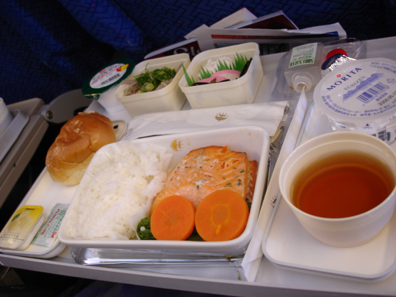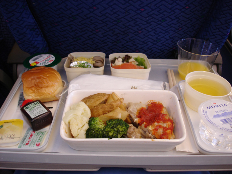 離陸してすぐに機内食が出てきた。 チキンとパンとチンゲン菜。 このチンゲン菜がすごいニンニクの臭いがした。 パンは意外にもおいしくてビックリ。