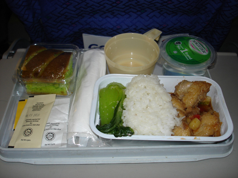 クアラルンプールまでは6時間5分の飛行時間の予定。 離陸して一時間ほどで機内食が出てきた。 「和食のサーモンか洋食のチキン、どちらになさいますか?」、和食なのにサーモンっていうのもなぁ。 「和食の鮭」ではないのか。 どうでもいいけど、洋食を頼んだ。 ポテトとチキンとそばとサーモンのサラダとパン。 チキンはあまり食べられなかったけど、味は美味しかった。 食べた後はひたすら寝る体勢。