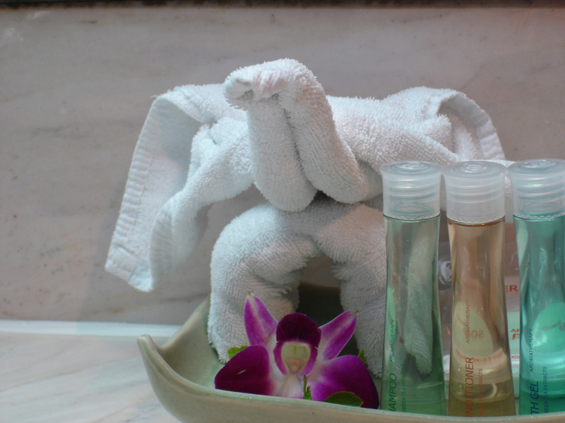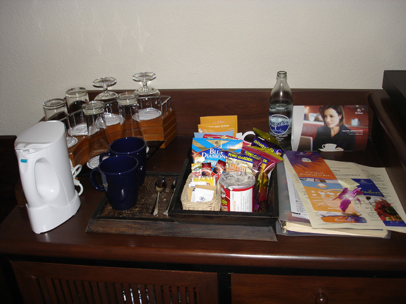 泊まるホテルは「カロンビーチ」にある「Hilton Phuket Arcadia Resort & Spa」というホテル。 ホテルについてビックリした。 まず、超巨大。 すさまじいでかさ! そしてフロントが屋外にある。 もちろん暑い…… Welcomeドリンクらしき、すっぱい謎の飲み物とおしぼりをもらい部屋に行く。 部屋は843号室。