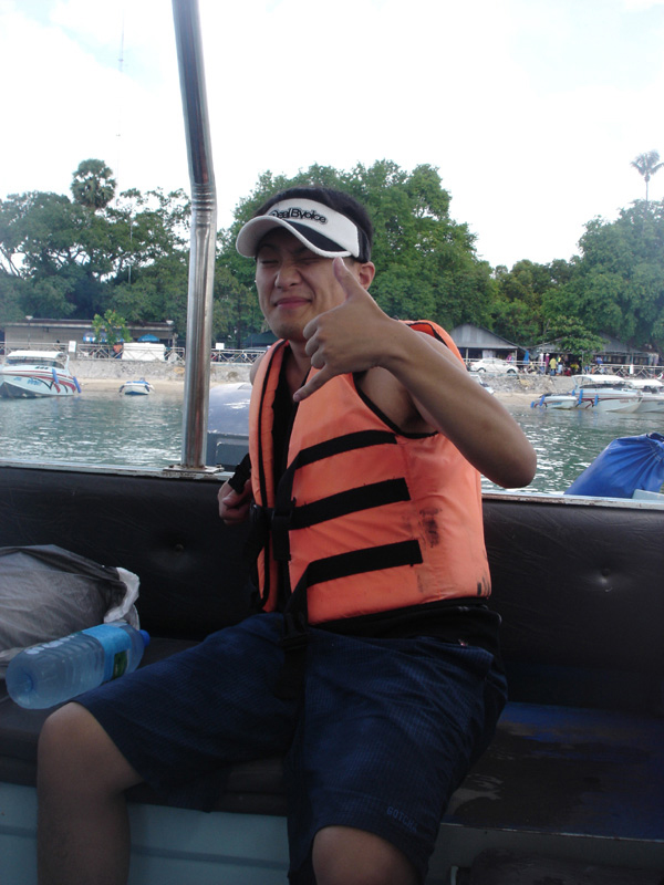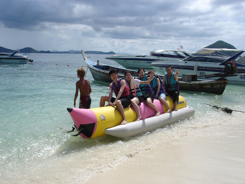 それからバナナボートに乗る。 5人乗りのボート。 モーターボートで海の上をひっぱられて急カーブで振り落とされる。 何度も何度も振り落とされた。 運転している人に「Very HARD」と言ったらすごい振り落とされ方をした。 体力の消耗が激しい…… 計5回も振り落とされてクタクタ。 だけど面白かった♪