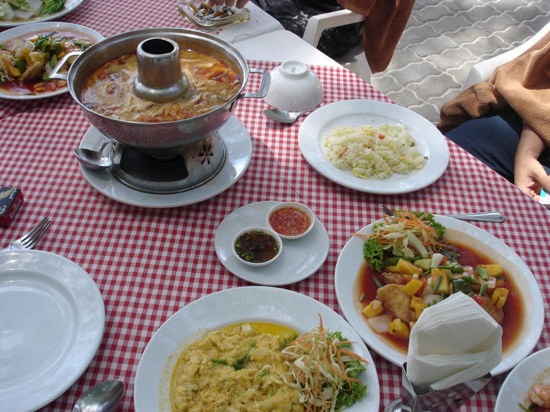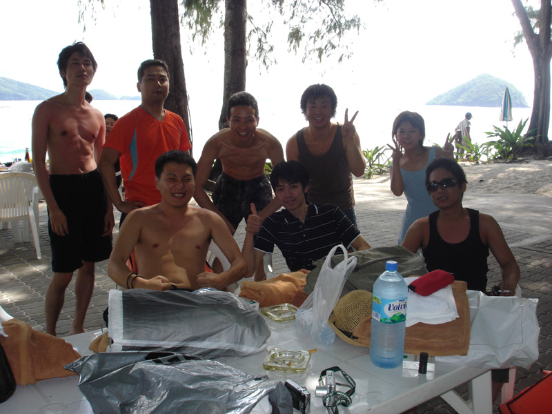 モーターボートでまたコーラル島に戻る。 そしてお昼の時間。 次々にテーブルの上に料理が並べられていく。 メイン料理は「トム・ヤム・クン」、これは不思議な味がした。 最初はすっぱい。 そして辛くなる。 うーん、まさにタイって味だな。 他にはチャーハンと白菜の炒め物と卵の料理やエビの料理など。 料理の名前がさっぱりわからない。 ジュースはパイナップルジュースを飲んだ。 これがとても甘くておいしかった♪