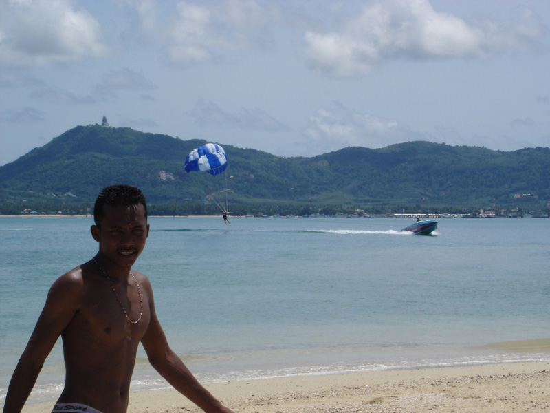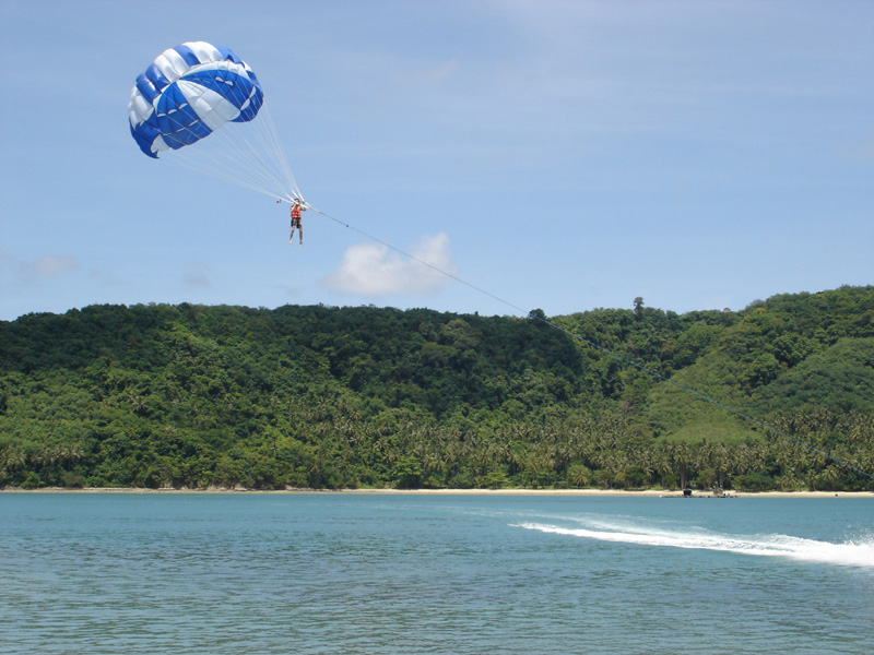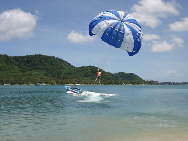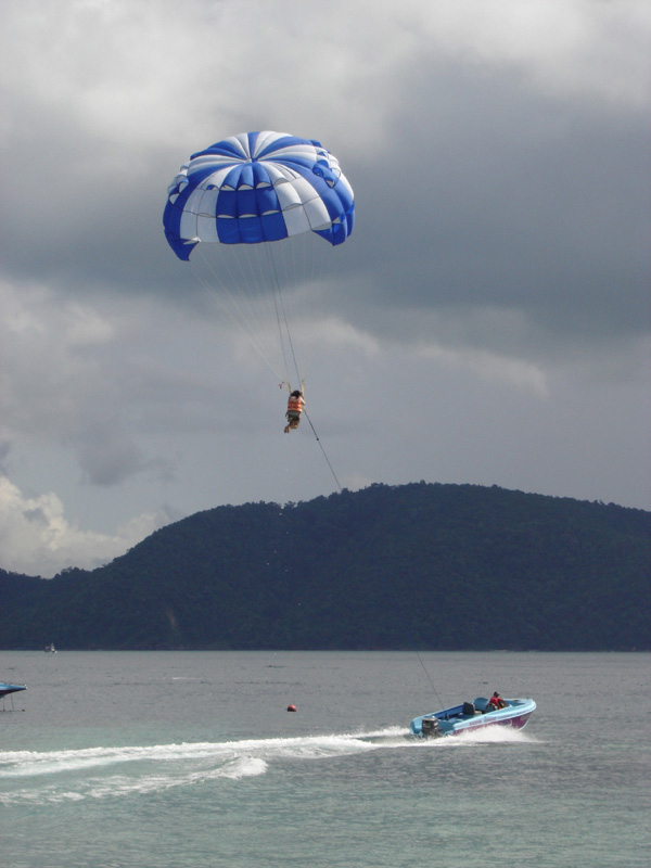 そしてようやくパラセーリングの順番が回ってきた。 パラシュートをつけて、モーターボートで引っ張ってもらう。 あっという間に体が宙に浮き上がる。 すごい気持ちいい! 高さは10~15mほどだけど、遠くの景色も見えるし、海面もすごい綺麗。 このまま空を飛んでいたい……と思ったけれど、あっという間に降りなくてはならないといけない時間になってしまった。 右後方にある紐を引っ張ればパラシュートが傾いて上手く降りられるらしい。 パラセーリングガイドのタイ人たちが「ヒッパッテー、ヒッパテー」というので引っ張る。 そしてだいたい降りてきたら「ハナスー」と言うので、手を離す。 無事着地。 パラセーリングってこんなに爽快なものだったんだ。 またやりたいなぁ。