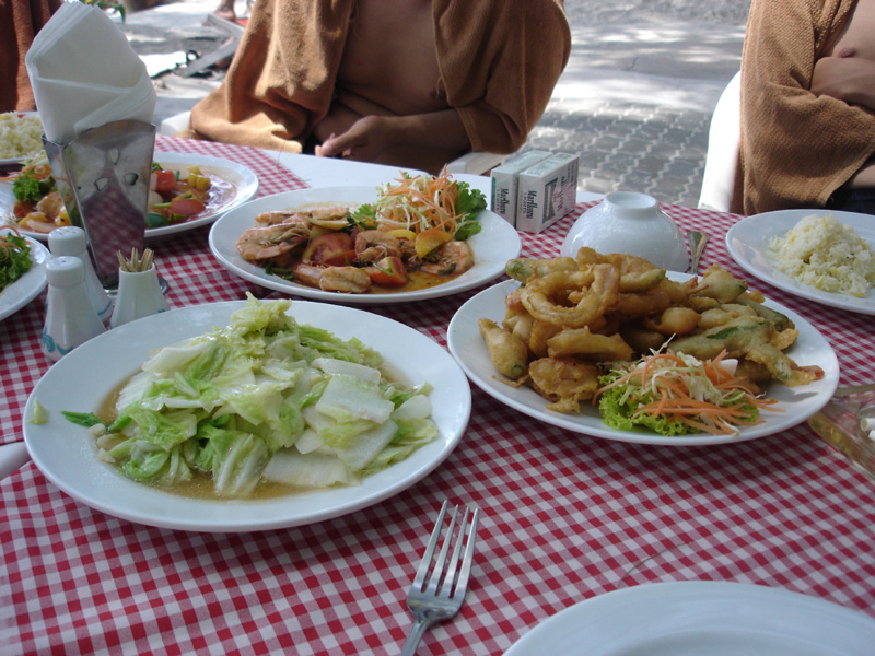 ホテルに帰りすぐ夕食。 「CENTRAL」というデパートの正面にある「タイナーンレストラン」という結婚式もできるような巨大か有名レストランらしい。 「グリーンカレー」や魚、辛い肉などがでてきた。 ホントに美味しいと思うタイ料理はなかったなぁ。 残念。 食事が終わってから「CENTRAL」でお買い物。 紳士服売り場でタイ人の半数が来ている黄色いポロシャツを買った。 ここでは2500バーツ以上の買い物をすると、この黄色いポロシャツが1つついてくる。 それほど、国民的カラーのポロシャツなんだよね。 日本にもこういうのが欲しい。