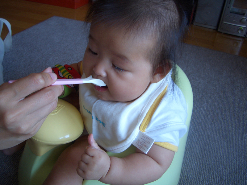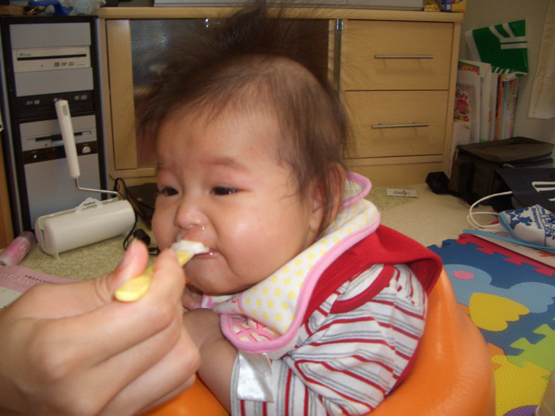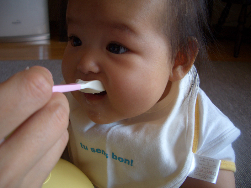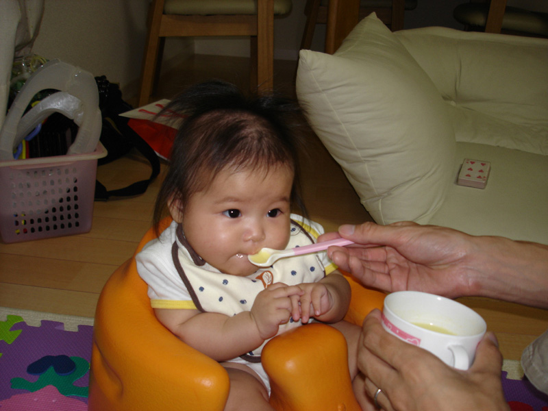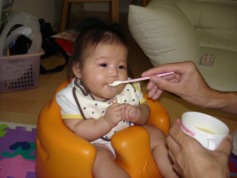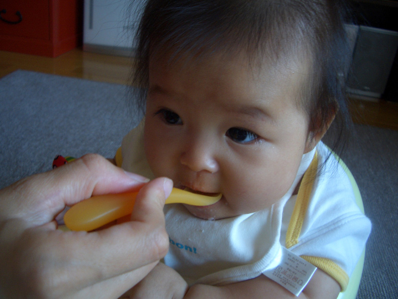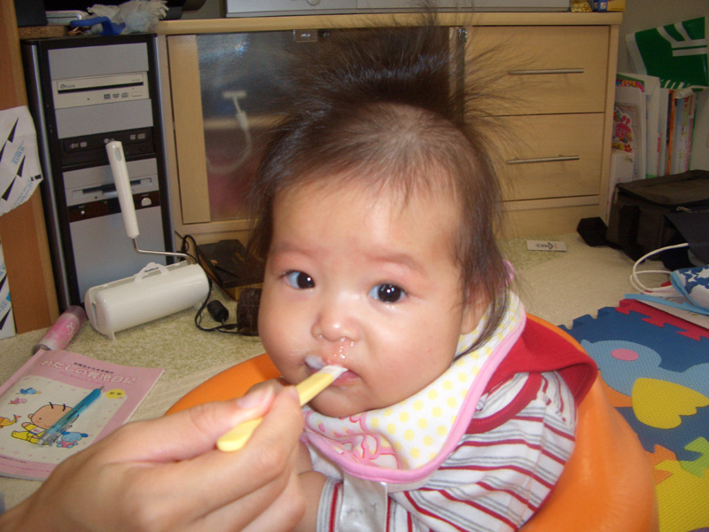 それと今日は次女に離乳食をあげた。 オレは初めてあげる。 すりつぶしたご飯をスプーンで食べさせる。 食べ物だとわかっているのかわからないけれど、口元に持っていくと、口をあけて食べようとする。 そのしぐさがかわいい。