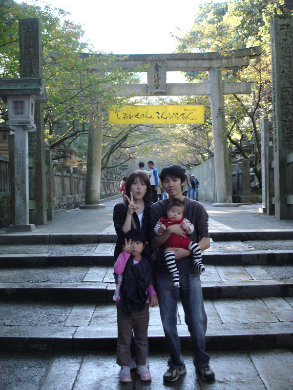 参道はいろんなお店があって、楽しかったみたい。 帰りにソフトクリームを食べるということで、元気に参道を登っていった。 オレは次女を抱いて、長女は自分で歩いて。