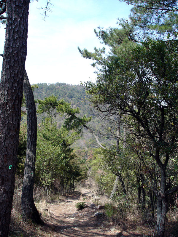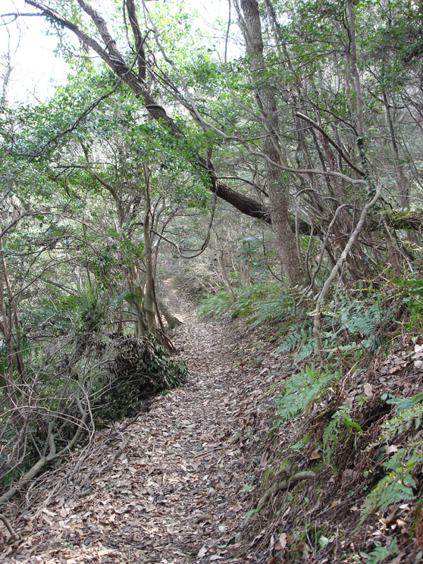 登り始めて5分ほど、本格的な登りに入った。 普通登山道というのは、右に行ったり左に行ったり、左右に蛇行しながら徐々に徐々に高度を上げていくものである。 しかしここは違う。 ひたすらまっすぐ直登するのだ。 そのため、傾斜がかなり急だ。