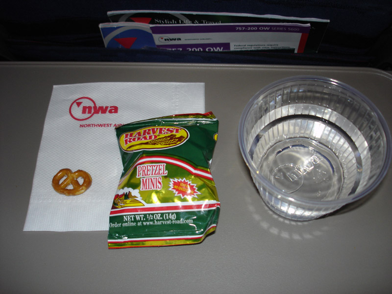 飛行機が飛び立って安定してから軽食タイム。 塩が振ってあって油で揚げたようなスナックがでてきた。