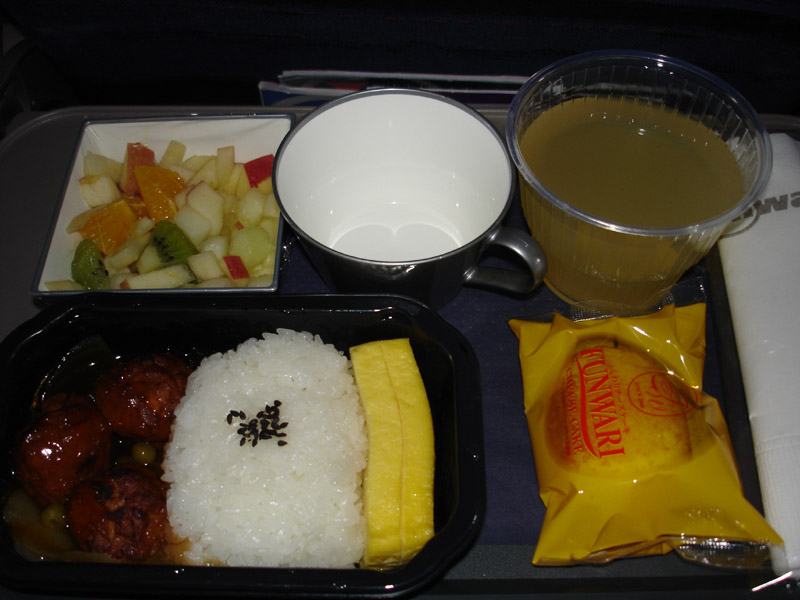 機内食は玉子焼き、ミートボールの大きめなやつ、細かくカットされたフルーツ、あと日本の会社が作ったパンみたいなお菓子だった。