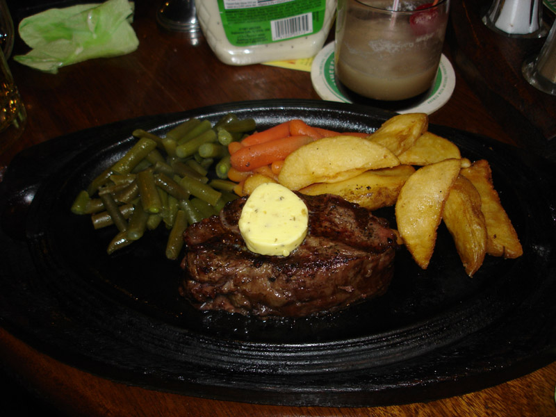 ステーキのセットを頼んだのだが、ステーキが出てくる前に、サラダとスープでけっこうお腹が膨れてしまった。 そしてステーキの登場。
