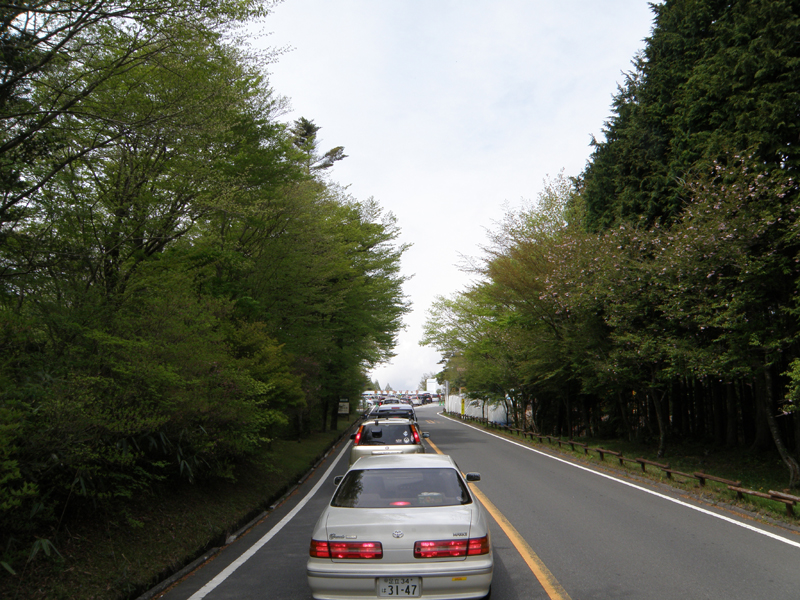 箱根の山を降りて、富士サファリパークまであと6kmくらいのところで大渋滞にはまる。 みんなサファリパークに向かってるんだな、きっと。 全然進まないので、ナビを駆使して、地元の林業車が軽トラックで通るような道を発見。 この車で通れるかはすっごい不安だったが、ナビを頼りに山のほうへ入っていったら、とても荒れた道だったが、けっこうなショートカットになった。