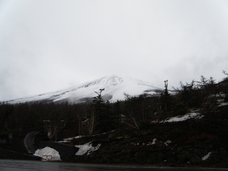 「富士吉田登山口」を目指して車を走らせる。 富士五湖有料道路で富士吉田ICまで行って、そこから富士スバルラインを通り、5合目まで向かう。 文字で書くとあっという間だが、距離も20kmくらいあるし、標高も2300mまで一気に登る。 森林限界を超えているので、岩や低い木ばかりが目立つし、雪もけっこう残っている。 道路自体は除雪がされているので、ノーマルタイヤでも問題ないが。