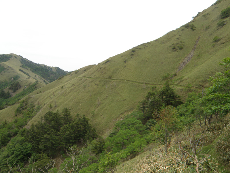 丸石方面に向かう道から次郎笈を降り、トラヴァースルートを歩いてきた。 途中に湧き水があり、手と顔を洗ったのだが、ものすごい冷たくて気持ちがよかった。