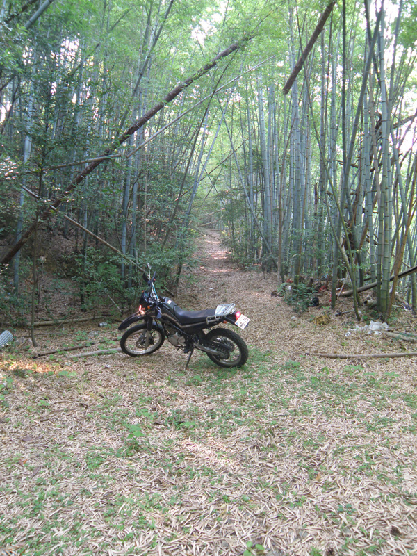 しばらく走ると道が舗装されていない道に変わった。 山に入っていく…… そのまま進むこと1km。 ここより先はバイクでとおれそうにない道に変わった。