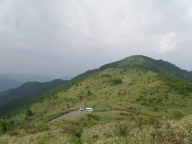 準備をして9時登山開始。 始めは笹の中の急な登りが続く。 10分ほど歩き、登りがひと段落。 落合峠のほうを見渡すと、駐車場がもうあんなに遠い。 一気に標高を上げた感じだな。