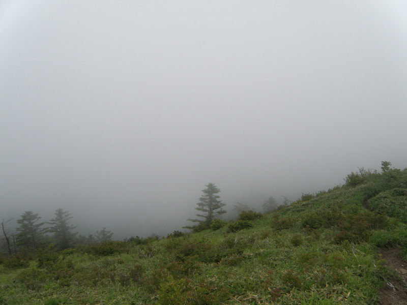 山頂で少し休憩をしたが、こちらもガスに巻かれてきた。 急いで帰らなくては……