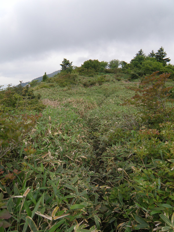 しばらくは平坦な道が続く。 しかしこの矢筈山、笹が深いね。 腰くらいの高さまであるところもある。 足元が見えなくて躓きそうで恐ろしい。 しばらく歩いたら「サガリハゲ山」という山が見えてきた。 名前が印象的。