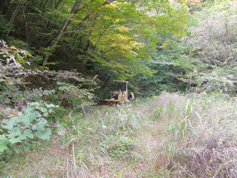 しばらく歩くと放置された重機があった。 この重機、撤去するにもここまで車が入ってこれないから撤去できないな。 いつになったらなくなるのだろうか。